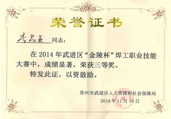 2014年11月15日,由武進區人力資源和社會保障局主辦的焊工技能大賽在武進三河口舉行,季昌亞作為常州一步代表參加比賽,比賽分為理論知識和實際操作,實際操作由氣保焊和氬弧焊兩組交替進行,通過一個半小時的實際操作,對選手的焊接技術進行評分。經過緊張激烈的決賽,我公司員工季昌亞同志榮獲焊工技能比賽三等獎。