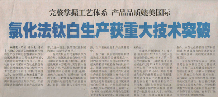 12月21日至22日,“全國首屆沸騰氯化法鈦白生產技術研討會暨漯河興茂鈦業氯化法鈦白工程技術評審會”在河南省漯河市金港大酒店隆重召開,來自全國鈦白行業的著名^云集漯河,對漯河興茂鈦業股份有限公司沸騰氯化法鈦白工藝的相關生產技術工藝進行了研討、評審,^終形成了^評審意見。評審^指出,漯河興茂鈦業沸騰氯化法鈦白工藝依據其設計、運行效果和產品質量的綜合評價,已完整地掌握了氯化法鈦白粉生產工藝技術體系,擁有獨立的自主知識產權,該項目已達到國內^、國際^。