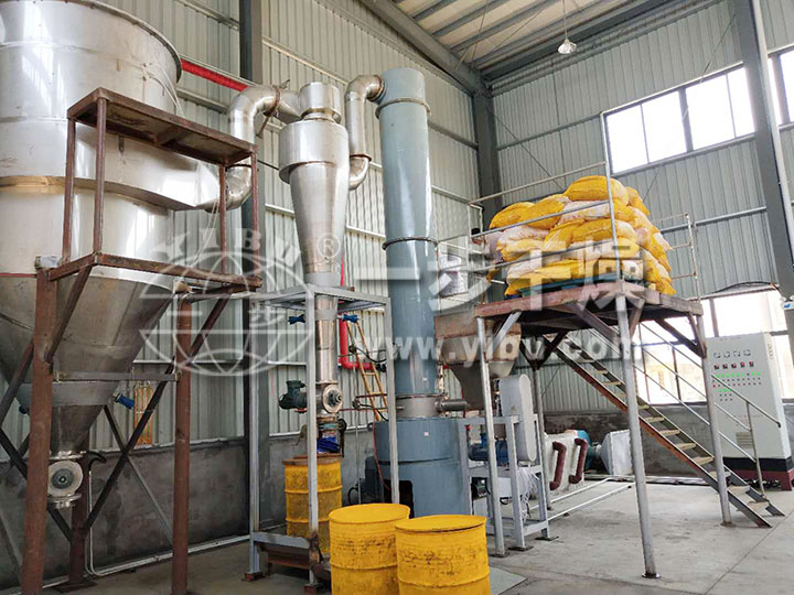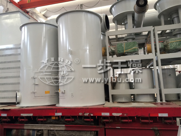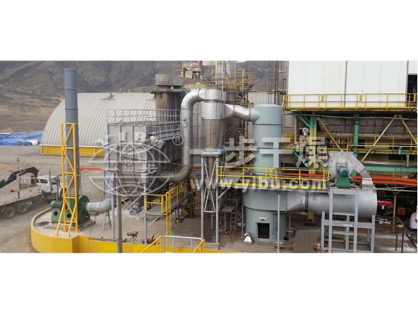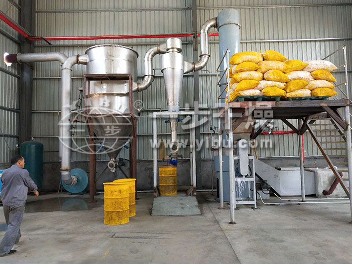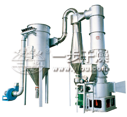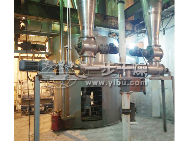 熱空氣切線進入干燥器底部,在攪拌器帶動下形成強有力的旋轉風場。膏狀物料由螺旋加料器進入干燥器內,在高速旋轉攪拌槳的強烈作用下,物料受撞擊、磨擦及剪切力的作用下得到分散,塊狀物料迅速粉碎,與熱空氣充分接觸、受熱、干燥。脫水后的干物料隨熱氣流上升,分級環將大顆粒截留,小顆粒從環中心排出干燥器外,由旋風分離器和除塵器回收,未干透或大塊物料受離心力作用甩向器壁,重新落到底部被粉碎干燥。